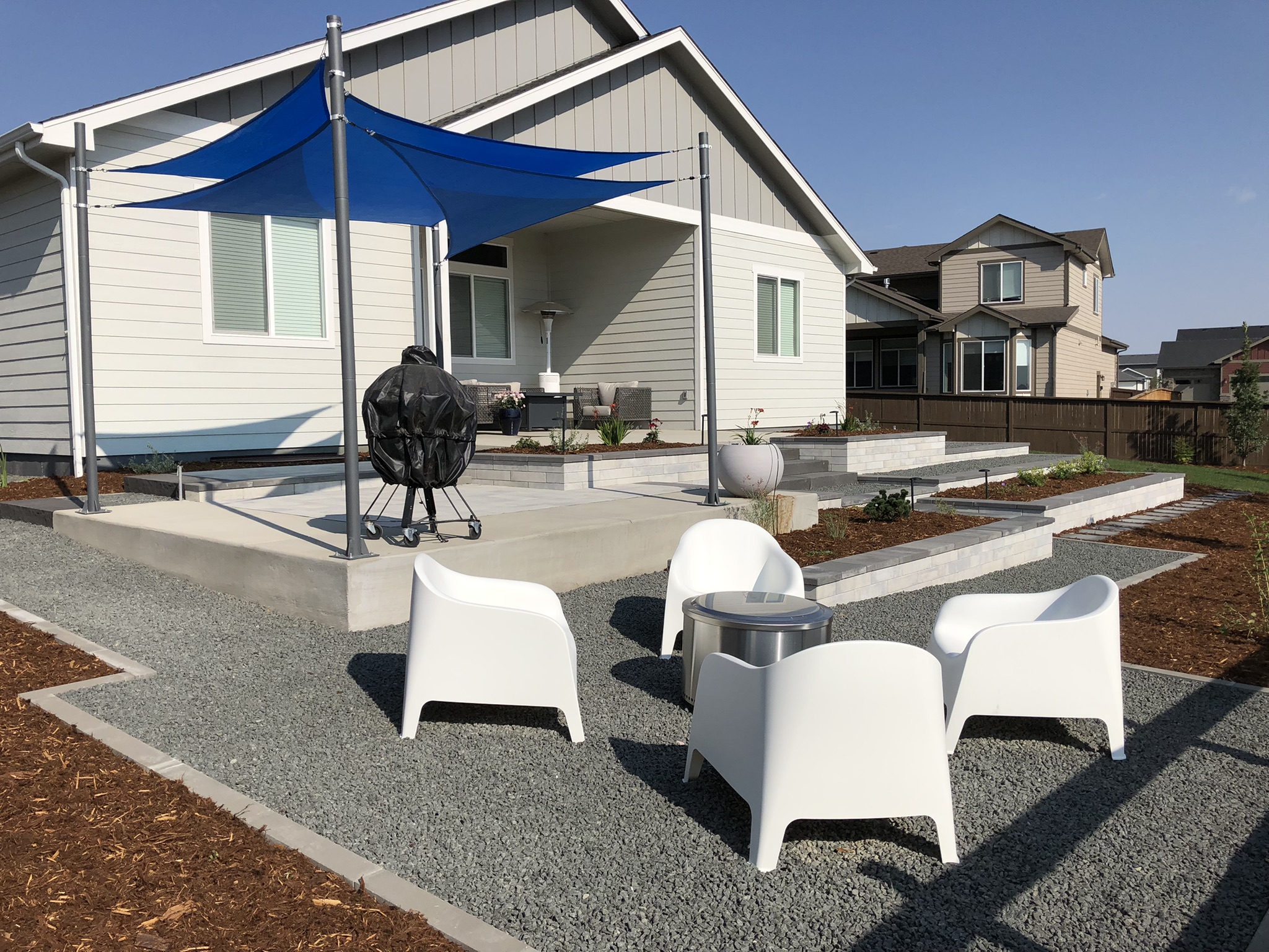 Loveland, Colorado was designed to fit the client's contemporary aesthetic. Belgard materials such as Melville Wall,Curb and Plank Paver were employed as well as St. Vrain Block non-tumbled Quarry Stone block wall material to create a contemporary and monochromatic hardscape. Front landscape included a raised planter bed that obscured the side view of an elevated concrete front porch. Backyard path passed contemporary block raised vegatable beds and lead to a future outdoor kitchen area, patio and a fire pit patio. Continuing around the back landscape leads to a long turf area for play. Please visit the Portfolio pdf and this video and Entertainment Portfolio to see more after images of this amazing landscape.